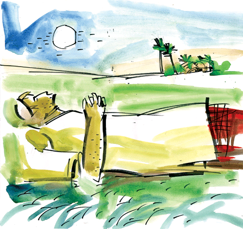 আমার বাবা, মধ্যে মধ্যে, যেসব স্বপ্ন ঘুম ভাঙলে মনে পড়ত, সেসব বলতেন। আমাদের জানাতেন, কেন সুপারির বাতার ওপর শুয়ে থাকতেন এবং ঘুমাতেন। বাড়ি ছেড়ে এতদূর এসে কেন ঘুমাই জানিস। বাড়ির ভিতর তাজা হাওয়া নেই। হাওয়া সব গিলে নিয়েছে ভিটাগুলি আর মেয়েমানুষের ঝগড়াঝাঁটি। এখানে তাজা হাওয়া সারারাত নাচানাচি করে। তোরা হয়তো জানিস, এক সময় আমি শহরে চাকরি করতাম। সে-চাকরি আমার ভিতরের চাষাভুসো মানুষটাকে মেরে ফেলতে পারেনি। আমি ফিরে পেতে চাইতাম ধুধু মাঠ, সবুজ ঘাস, বহুদূরের পাহাড়, যদিও আমাদের এলাকায় পাহাড় নেই, নেই বলে এলোমেলো পাহাড়ের স্বপ্ন কি দেখতে নেই? আমি নীল দেখতে ভালোবাসতাম, সবুজ দেখতে ভালোবাসতাম, শাদা দেখতে ভালোবাসতাম। এসব রং আমার চোখে খেলা করত, আমাকে ঘুম পাড়াত। স্বপ্ন দেখে দেখে ঘুমানোর মাজেজা আলাদা।