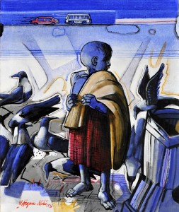 888sport live chatীর প্রিয় টোকাই-চরিত্রও 888sport live chatের বিষয় হিসেবে এখানে আদৃত। ‘টোকাই-১’, ‘টোকাই-২’, ‘পথশিশু’ প্রভৃতি চিত্র ছাড়াও ‘প্ল্যাটফরমে’ টোকাইয়ের সন্ধান মেলে। বস্তা-কাঁধে, ফুটপাতে কিংবা দেওয়ালের ওপরে, কখনো বাঁশিমুখে তাদের জনকোলাহল থেকে বিচ্ছিন্ন অবস্থানের মধ্যে প্রান্তিক জীবনবৈশিষ্ট্যটি ফুটিয়ে তুলতে সচেষ্ট থেকেছেন 888sport live chatী। এই প্রান্তিকতার সঙ্গেই যেন নাগরিক জীবনে কাকের এক অবিচ্ছেদ্য নিবিড় সম্পর্ক। যেখানেই টোকাই, সেখানেই কাক – এই অবিচ্ছিন্নতা চিত্রের জমিনে মূর্ত হয়েছে।