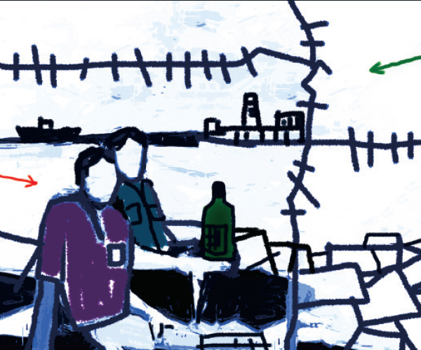 পুলিশ দুজনের কী হয় কে জানে। তাদের ইশারা-ইঙ্গিতের পাঠোদ্ধার খুরশিদ-ইনানির কাজ নয়। তারা তাদের মাল্টা, জাহাজ, পাসপোর্ট রেখে আসা এসব গল্পে কোনো আস্থাই রাখতে চায় না। উলটো খুরশিদ এবং ইনানিকে পাশাপাশি দাঁড় করিয়ে প্রায় আদেশের সুরে বলতে থাকে – শোনো, তোমাদের কাছে নিষিদ্ধ বস্ত্ত মদের বোতল পাওয়া গেছে। তোমরা আসামি। এখন আমরা যা বলি মন দিয়া শোনো। দুজনে খাড়াও এইহানে। একজন পুলিশ তাদের দুজনকে হাতে-কলমে পাশাপাশি দাঁড়ানোর ভঙ্গিটা দেখিয়ে দিতে থাকে। আর অন্যজন তখন তার পকেট থেকে মোবাইল সেটটা মুঠোয় বাগিয়ে ধরে। তার কাঁধে বন্দুক, মাথায় টুপি, গায়ে ইউনিফর্ম এবং হাতে মোবাইল সেট। সেটটা কী বোঝা দুরূহ তবে আয়তাকার ও চওড়া সেই সেট হতে পারে অপ্পো, হতে পারে স্যামসাং কিংবা সিম্ফনি, তবে আইফোন নয়, যার হাতে মোবাইল নেই তারও কাঁধে বন্দুক এবং অন্যসব আনুষ্ঠানিকতার বিন্যাস। তবে একটু আগেই তার হাতে যে-ব্যাগটা ধরা ছিল এবারে সেটার মধ্যে দুই হাত গলিয়ে দিয়ে সে বোতলটা বের করে আনে। বোতলটার আদি মালিক খুরশিদ এবং সেটির সম্ভাব্য ভোক্তা তারা দুই বন্ধু। দুজনেই আমতা-আমতা করে কিছু বলার চেষ্টা করলে দুই পুলিশ প্রায় সমস্বরে ধমক লাগায় –